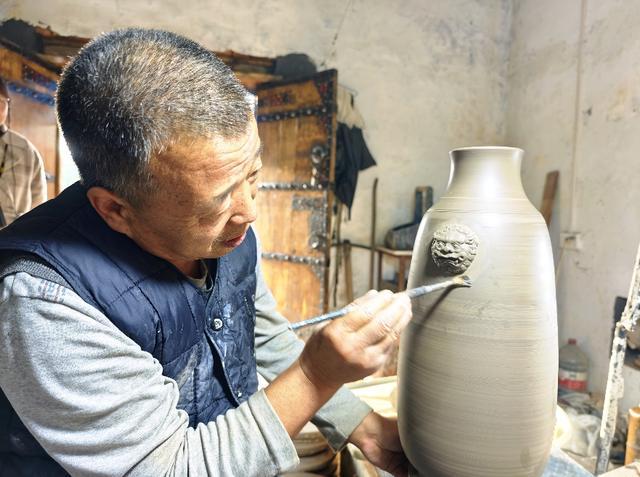 在景区的一间作坊里,国家级非遗传承人刘忠阳正全神贯注地制作花瓶kaiyun官方。他的双手沾满泥浆,指节粗大,却稳健地在一台拉坯机上,拿捏着一团混沌的泥巴。